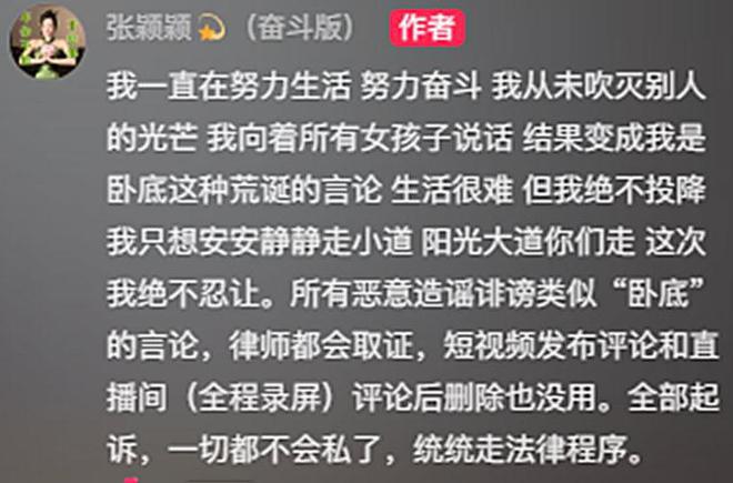另外张颖颖还表态称,关于网上所有造谣、诽谤她是 " 卧底 " 的言论,律师都已经取证,就连直播间刷屏的动态留言也已经录屏截取,即便删除评论也没用,全部都将起诉,一切都不会私了,通通走法律程序。