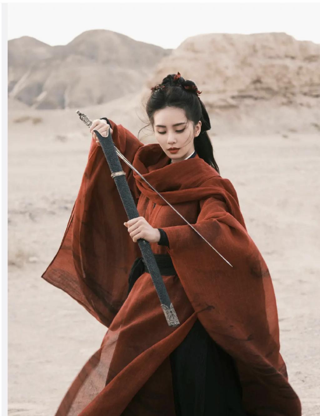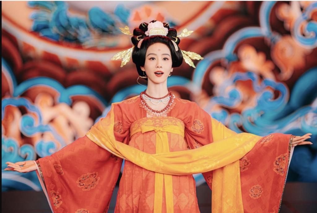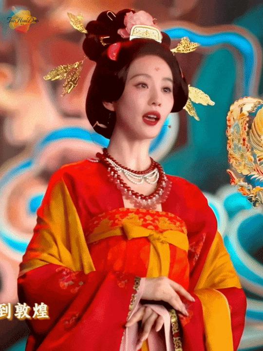 红色戏服,齐胸襦裙 + 大袖衫,演绎了晚唐的华丽。