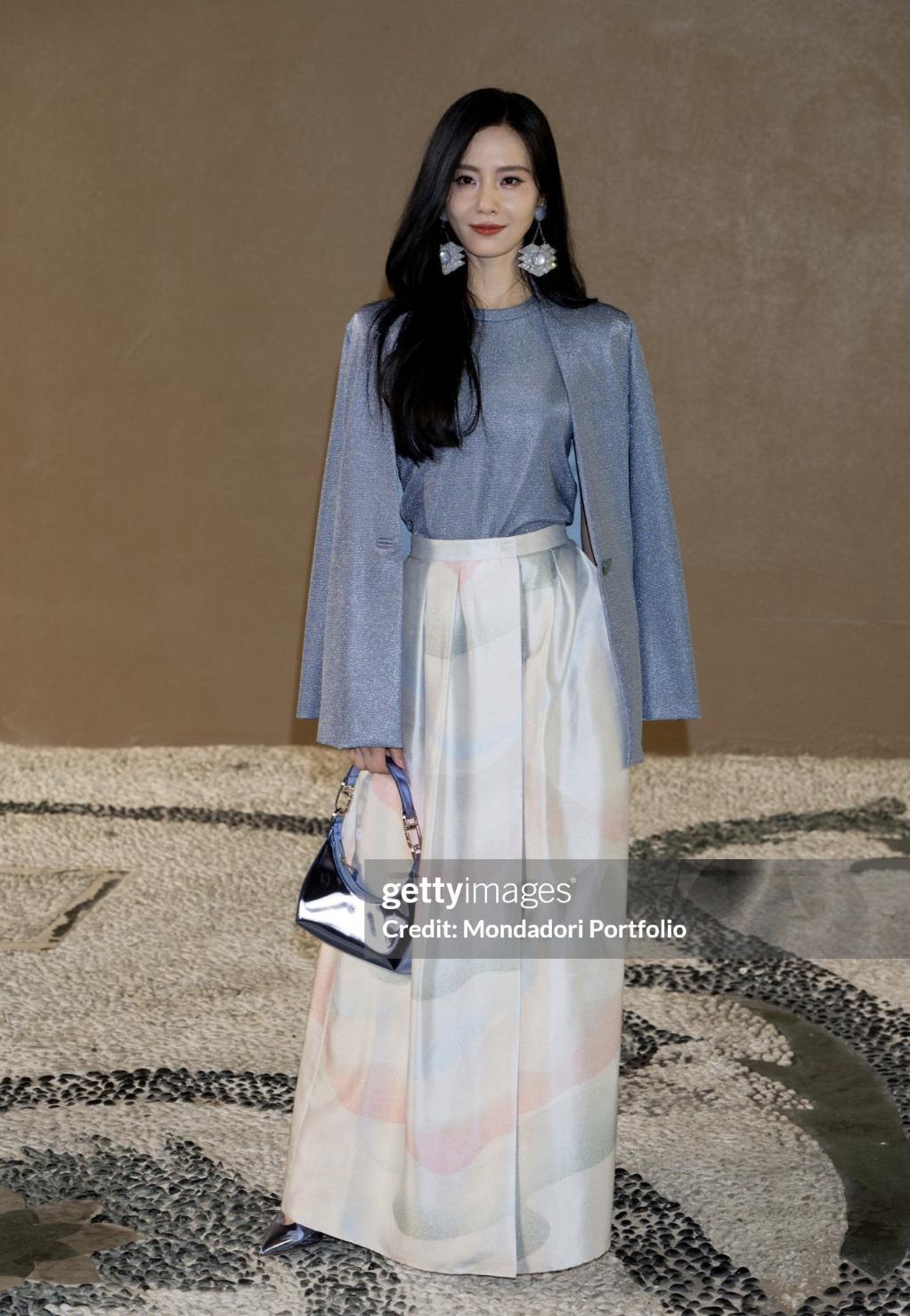刘诗诗一身干净的蓝色西装,白色长裤,优雅而随性。