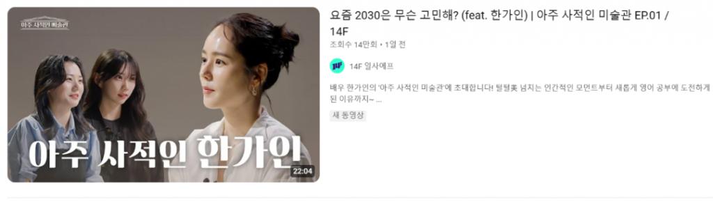 22 日,YouTube 频道 14F 公开了韩佳人作为嘉宾出演的网络综艺节目《非常私人的美术馆》的视频。视频中,受邀参加韩佳人个人展的两位素人看着韩佳人过去的照片与她进行了交谈。