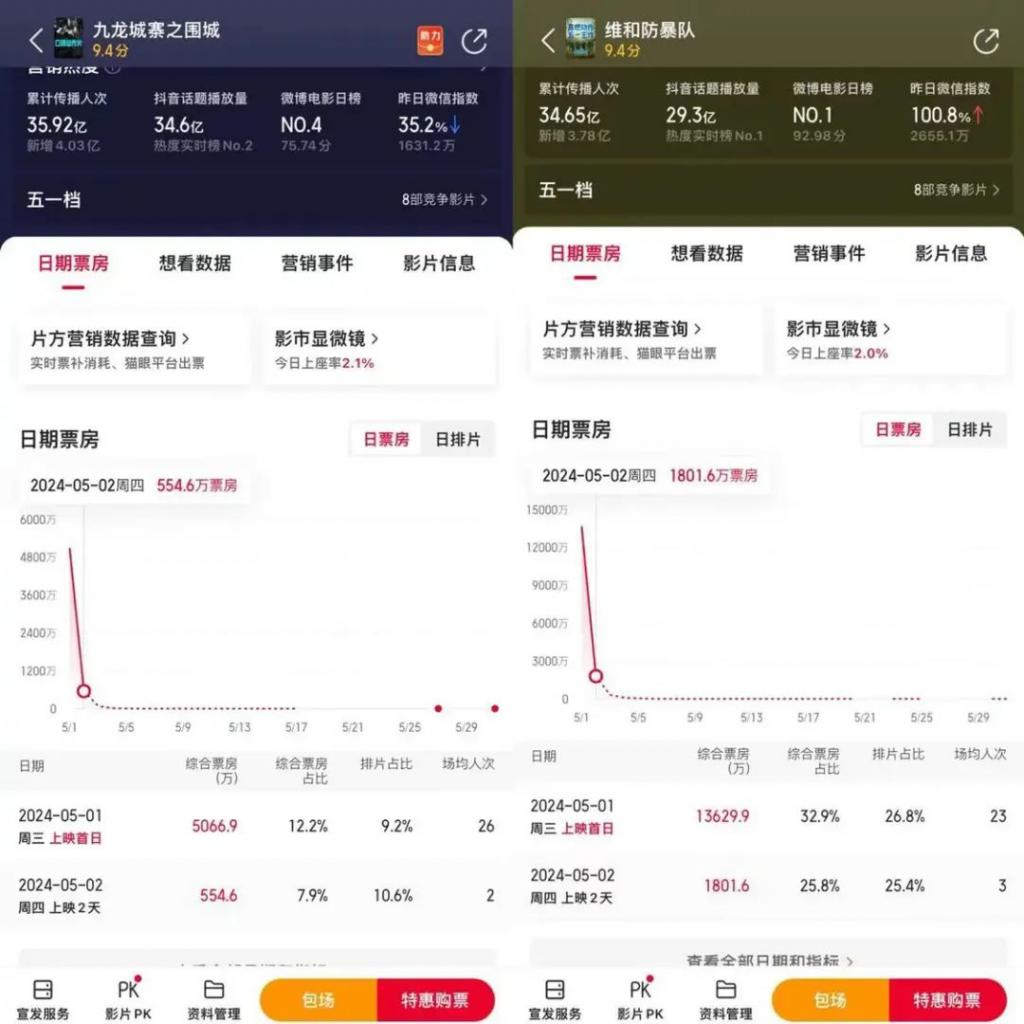 从 5 月 1 日的数据来看,《维和防暴队》单日票房 1.36 亿,排片占比高达 26.8%,为当日排片冠军,而此前五一档票房榜首的《九龙城寨之围城》五一档首日排片仅为 9.2%。也在当天被《维和防暴队》票房反超。