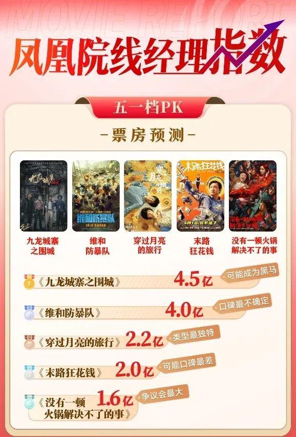 此前,根据凤凰网娱乐 " 凤凰院线经理指数 " 曾预测,今年五一档《九龙城寨之围城》可能成为黑马,将超越《维和防暴队》成为票房第一,两者票房差距约为 5000 万。从如今票房形势看来,两部影片相差 2000 多万票房,仍将进行激烈角逐。