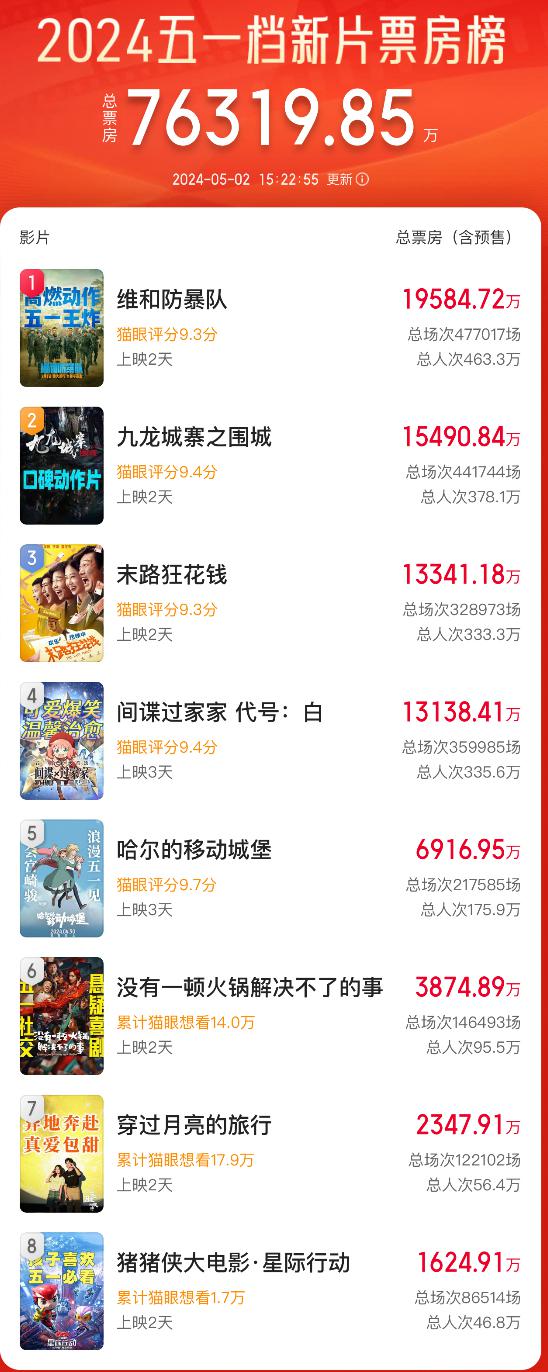 0 截止 5 月 2 日 15 时 22 分,黄景瑜、王一博新片《维和防暴队》以 1.96 亿总票房,反超古天乐新片《九龙城寨之围城》,暂列五一档票房冠军,《九龙城寨之围城》以 1.55 亿票房跟随其后。