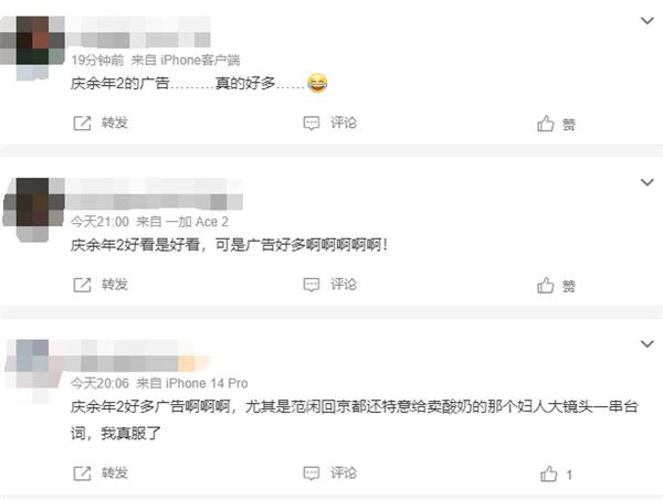 随着《庆余年 2》的播出,许多网友也开始讨论起剧情,同时也有网友吐槽 "《庆余年 2》广告多 "。网友表示:" 一集十个广告 "" 尤其是范闲回京都还特意给卖酸奶的那个妇人大镜头一串台词 "" 庆余年火的五步一广告,十步一堆广告 "等等。