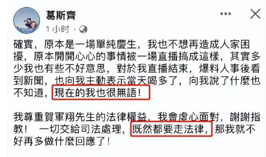 去年 5 月份,葛斯齐曾开直播爆料说贺军翔为好友张勋杰庆生时,与辣妹在娱乐场所三度接吻,不守男德,枉为人夫。