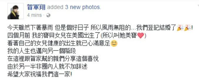 俩人 17 年官宣结婚,同事贺军翔晒出了自己的第一个 baby,一副家庭幸福的好爸爸模样。
