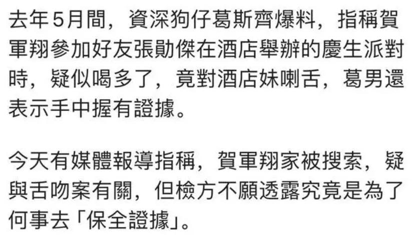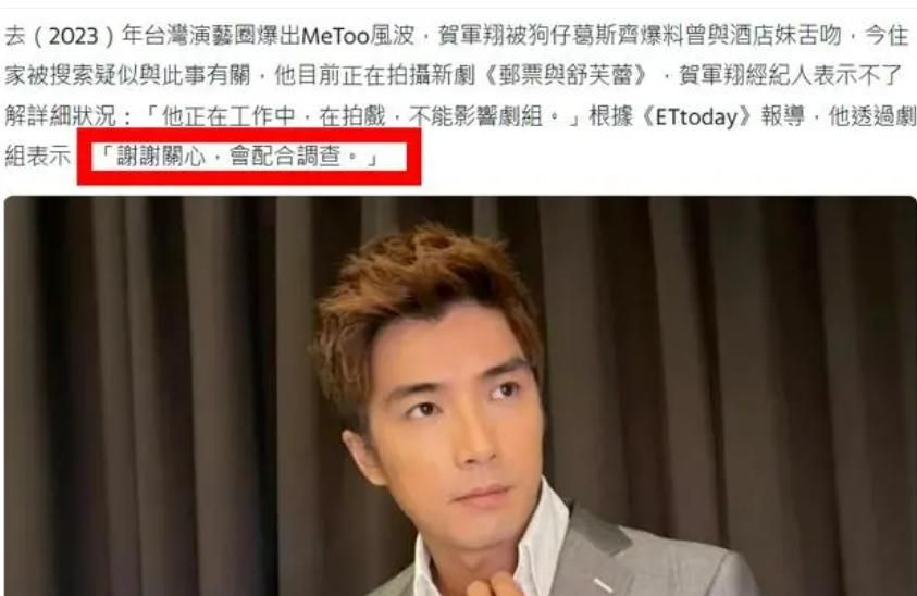 前天台媒报道称贺军翔的寓所遭到当地警方搜索,他本人疑似卷入刑事案件,并被列为被告。