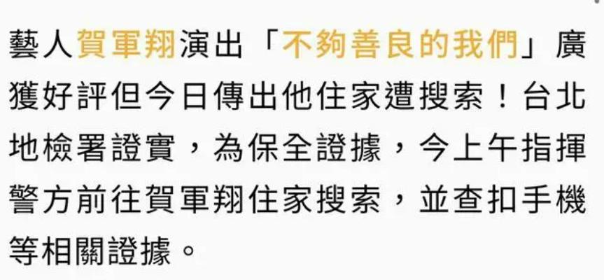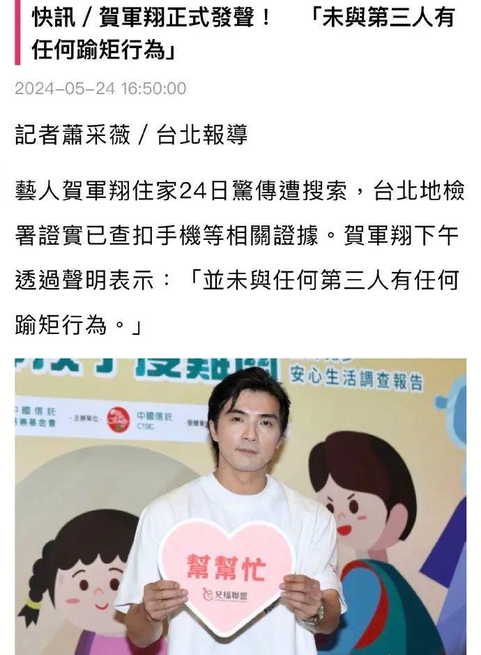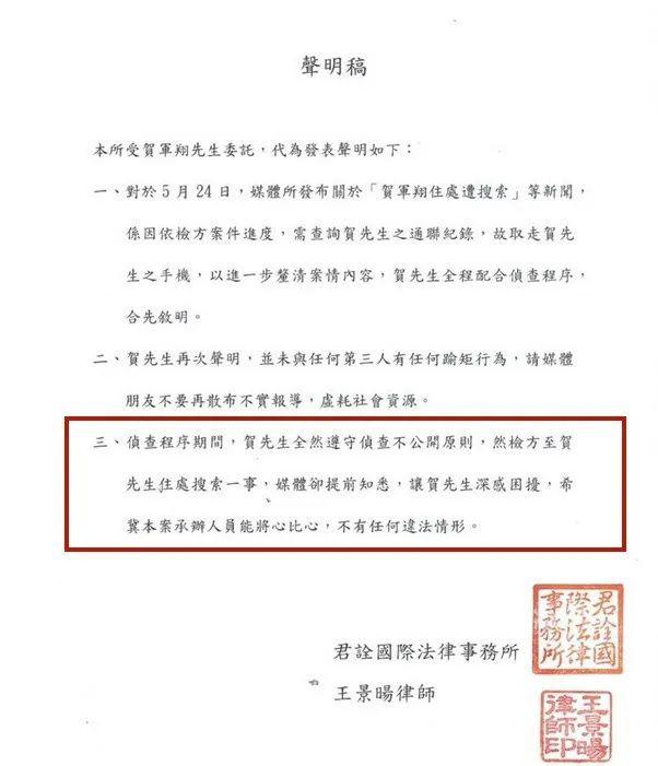 发了一则声明,说贺军翔没有和任何人有逾矩行为,检方之所以拿走贺军翔手机,是为了理清案情内容。