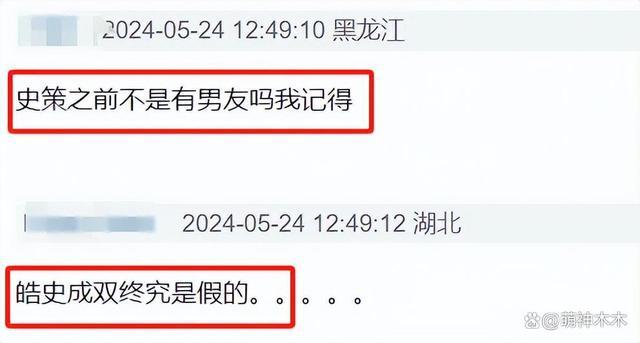 据悉,女方史策那边有大热 CP" 皓史成双 " 在营销,粉丝量还不少,如今恋情曝光,粉丝纷纷破防。吐槽都有对象了,还放任 cp 营业。两个人的恋爱塌了好几家粉丝的房,也是内娱为数不多的存在了。