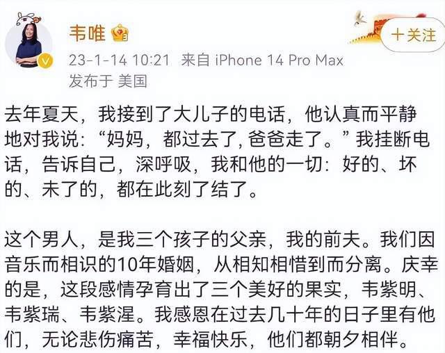 对此,韦唯写道,我和他的一切,好的、坏的、未了的,都在此刻了结了。