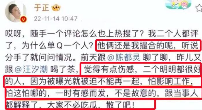 可能是因为负面评论太多了吧,于正很快又对此事做出了回应。他表示:“怎么随手一个评论也能上热搜啊?他们两个人是我撮合的,听说分手了我才问问情况,前两天跟陈都灵、汪汐潮两个人都聊了聊,他们都是很好的人,却因为担心恋情影响工作不能在一起,我觉得有点伤感。”最后,于正还为自己辩解道:“我不是有意的,已经和当事人说过了,散了吧。”