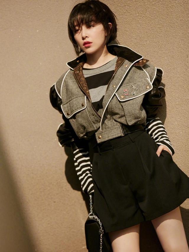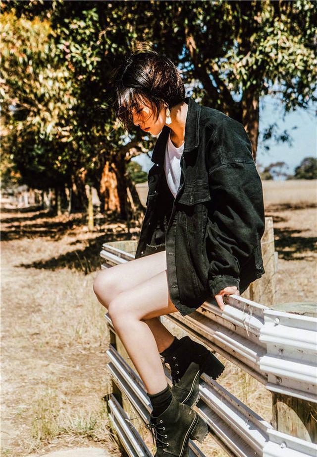 帅气清爽风黑色夹克+短裤阚清子的黑色宽松夹克搭上白色的T恤内搭,满满的都是学院帅气风。下身打了一条超短裤,配上一双马丁靴,整个的黑色搭配只有一件白色T恤来增添色彩。