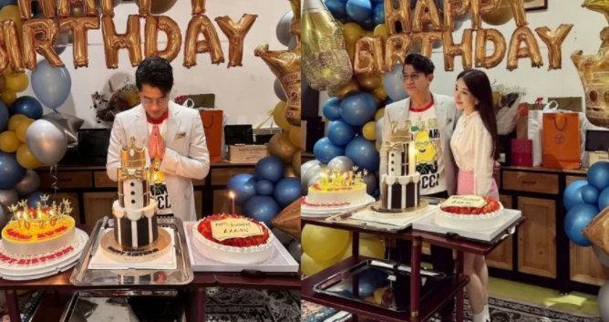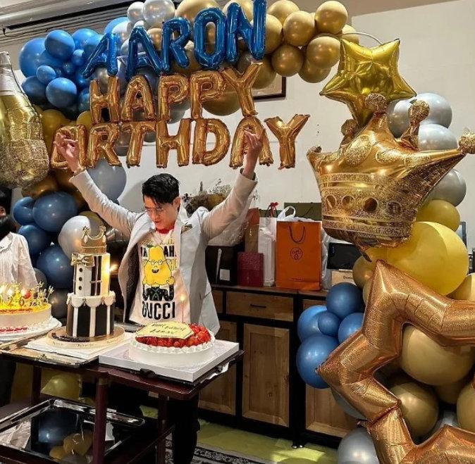 打扮一向很有心得的郭富城,生日派对又怎会马虎,生日会现场以金色、蓝色和银色气球装饰为主,拼成“AARON HAPPY BIRTHDAY”的字样,共有三个生日蛋糕,其中一个生日蛋糕是一个城堡的造型,上面有金色的蝴蝶结和皇冠,也凸显出郭富城“国王”身份,他也戴上金丝框眼镜,再配卡通T恤、浅色西装,整个打扮成熟之中又有童真,更有网民说郭富城完全没有变老,仿佛回春了20年,完胜现在时下的小鲜肉,看不出跟太太有22年的年龄差。