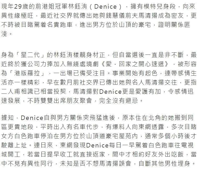 6 月 17 日凌晨,今年 29 岁的港姐冠军林钰洧(Denice)就被港媒爆料,指她与年约 60 岁的城中富豪马清扬成为密友,女方驾驶名贵跑车进出男方位于山顶的豪宅。