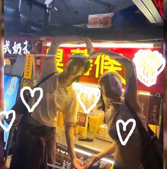 恩利和小伙伴们一起逛夜市,还和女同学一同比心。