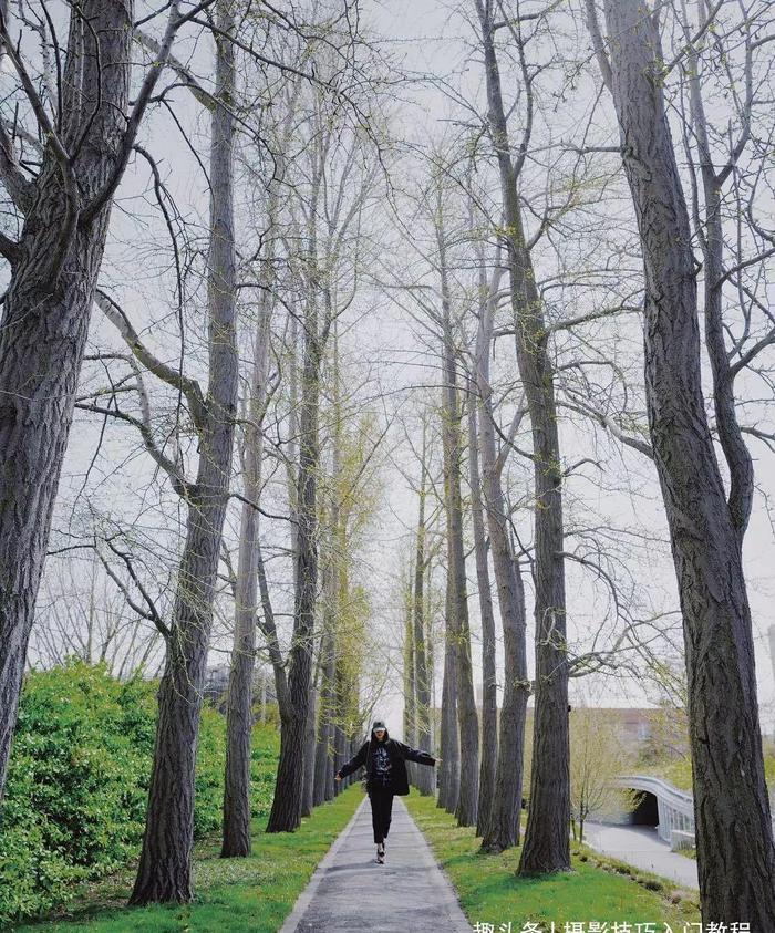 当你的拍摄场景有很强的对称属性,比如双排林、大马路、对称设计的建筑群等,就非常适合居中构图,突出主体人物的同时,画面也有规整的和谐感。