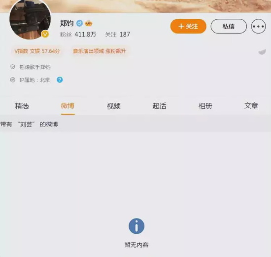 之所以这么说,是因为有人去了郑钧的账号,搜索刘芸的名字,结果是“暂时没有内容”。