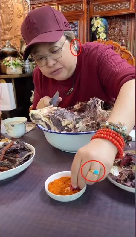 仔细一看还真是,韩红的左手无名指上,确实戴了一个蓝宝石戒指,而且跟耳钉是一套的,颜色很靓丽,很有藏式风格。