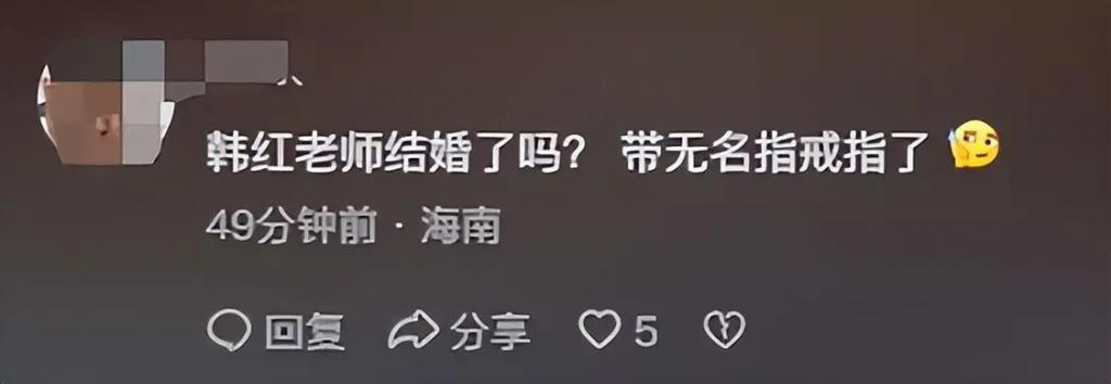 不过除了吃生肉的问题,还有一个地方也引起了部分网友的关注,那就是韩红的无名指上,竟然出现了一颗戒指!于是有网友发问:韩红老师这是结婚了吗?