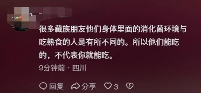 不过对于大家的担心,也有人进行科普,说藏族人的身体结构,以及那边的气候,跟其他地方都不太一样,我们不能吃,不代表人家不能吃。