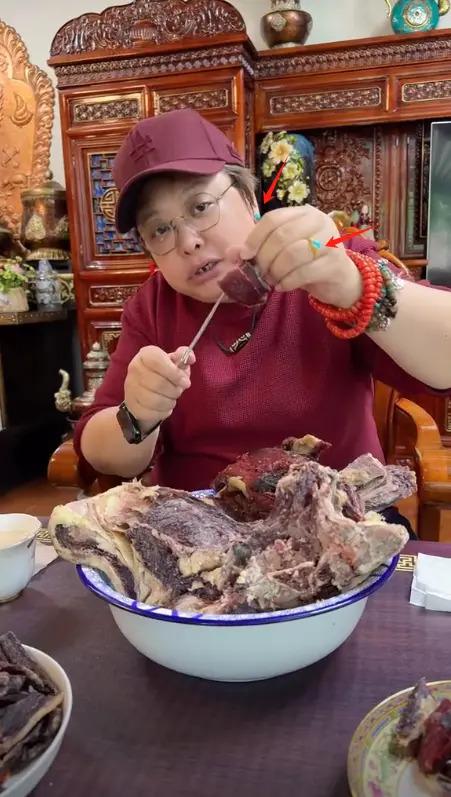 韩红瘦了!小脸大眼吃生肉,无名指戒指抢眼
