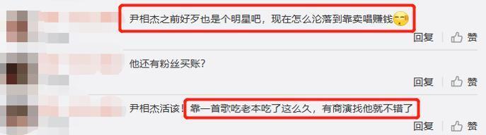 许多网友看到这一组照片后,纷纷评论道尹相杰老师变化太大了,好歹曾经也是个明星,现在居然靠商演捞金赚钱。还有网友表示尹相杰靠着一首歌吃老本,现在能有商演接就不错了。