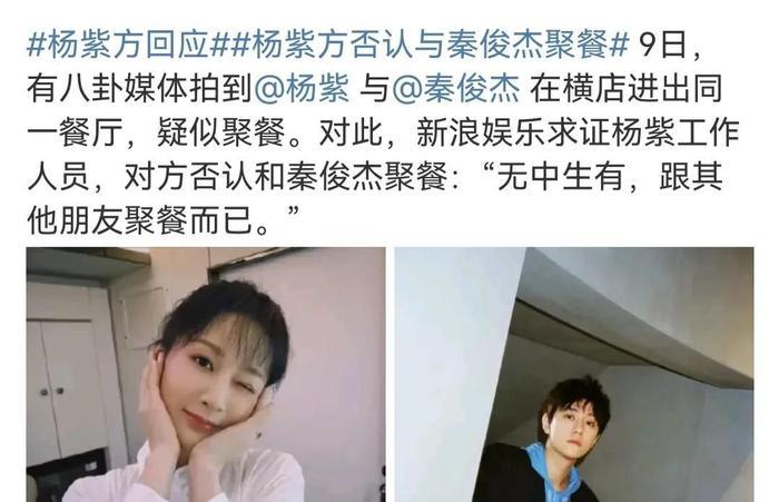 随后关于两人复合的传闻就上了热搜,不一会,媒体就向两人的团队求证,杨紫方反应很快,立刻出来回应,对方直接否认和秦俊杰聚餐:“无中生有,跟其他朋友聚餐而已。”