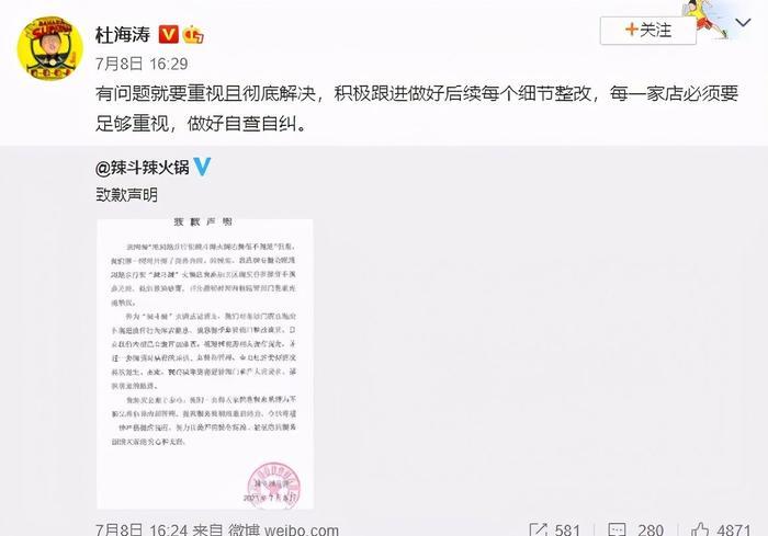 而辣斗辣大老板杜海涛,则是在事情过了好见天后才发表相关声明,这还不是杜海涛的道歉声明,这道歉声明是辣斗辣运营方发表的,杜海涛只是简单的转发了一下。