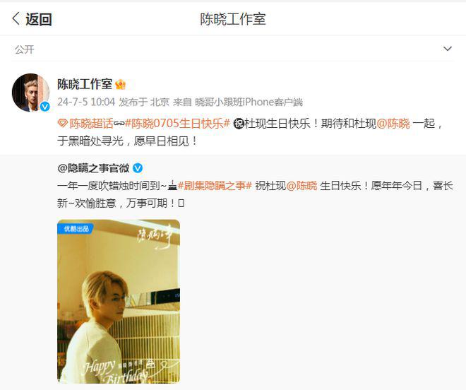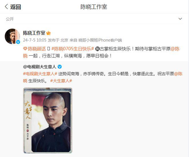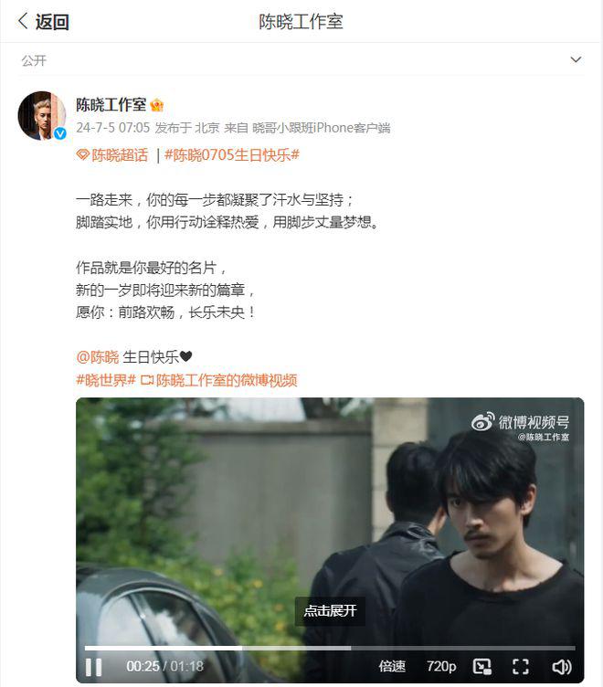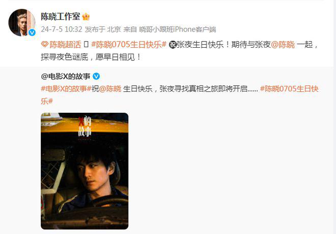 7 月 5 日是陈晓的 37 岁生日,当天零点零分的时候,陈晓工作室也在社交平台上晒出了一张海报,并且送上了真挚的祝福:" 愿你真诚书写的故事蓬勃璀璨✨愿你热情浇灌的理想肆意生长❤️",这也受到了网友们的广泛关注。