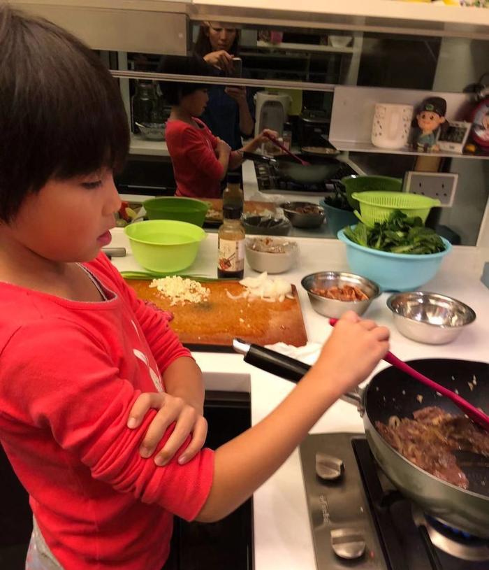 就连小女儿都开始做饭了,女儿一脸严肃看着锅里,十分认真,看上去动作也很娴熟,想来也是一向在家里自己动手的小孩子吧,而看穿着打扮都很居家,看来蔡少芬的教育还是主张的勤俭、节约,这对小孩其实也有很大的影响,不得不说这样的”富养“不仅是教会小孩生活,更是从小懂得自己动手,丰衣足食的好习惯!