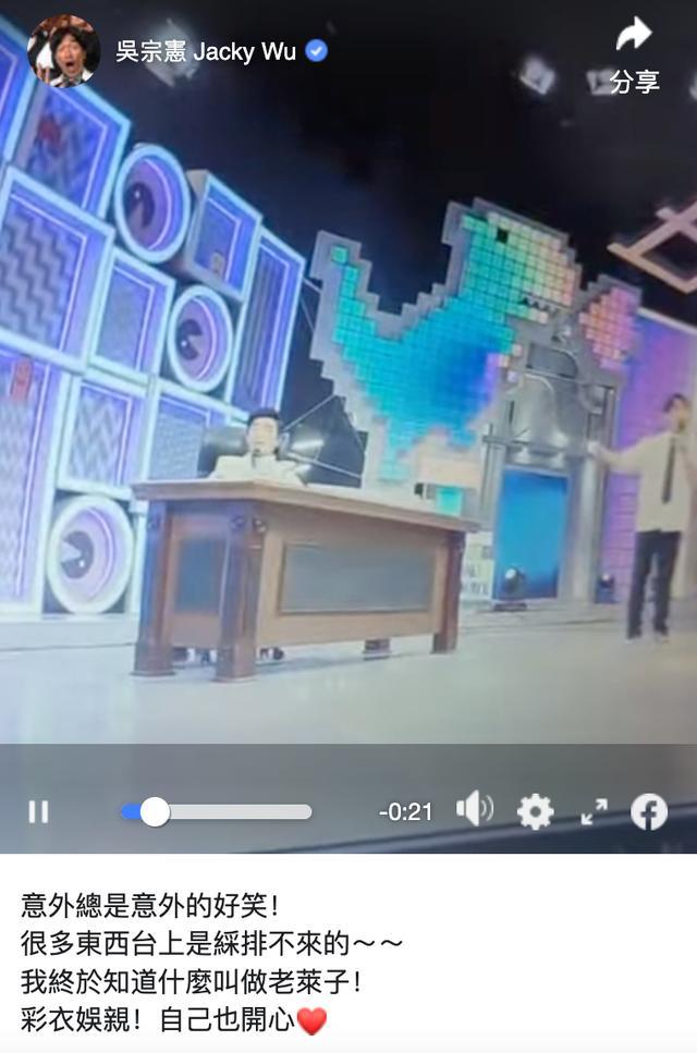 近日,吴宗宪本人在个人社交平台晒出一段自己在录制节目的过程中意外摔倒的视频,并配文强调“意外总是意外的好笑,很多东西台上彩排不来”,引起网友们热议。