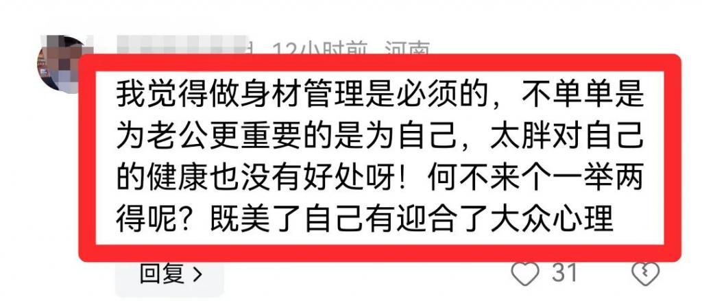 有网友喊话王琦:"我觉得做身材管理是必须的,不单单是为老公更重要的是为自己,太胖对自己的健康也没有好处呀!何不来个一举两得呢?既美了自己有迎合了大众心理"