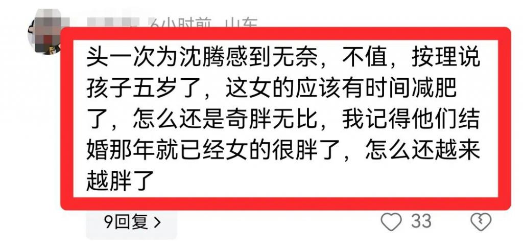 有网友无奈地说:"头一次为沈腾感到无奈,不值,按理说孩子五岁了,这女的应该有时间减肥了,怎么还是奇胖无比,我记得他们结婚那年就已经女的很胖了,怎么还越来越胖了"