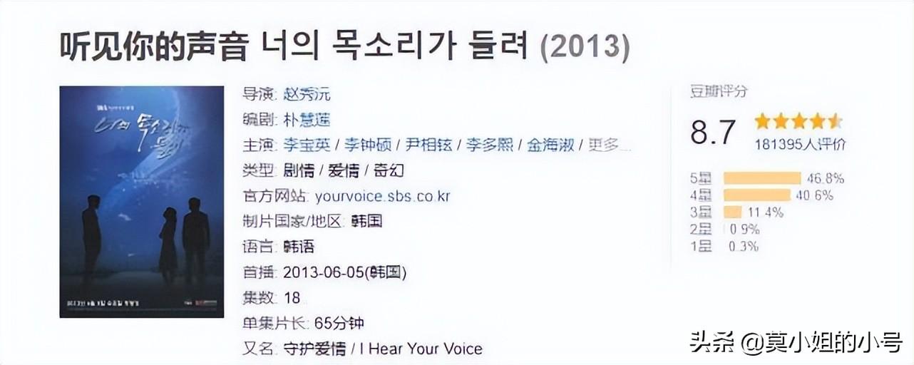 《听见你的声音》是在2013年上线的奇幻爱情剧,由李宝英、李钟硕主演,开播多年,评分一直维持在8.7分。