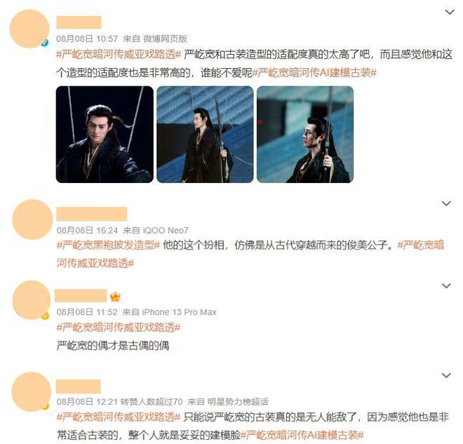 对于严屹宽的路透造型,网友的评价更是清一水地称赞," 严宽就是谪仙吧 "、" 严屹宽的偶才是古偶的偶 "、" 他这个扮相,仿佛从古代穿越而来的俊美公子 "。