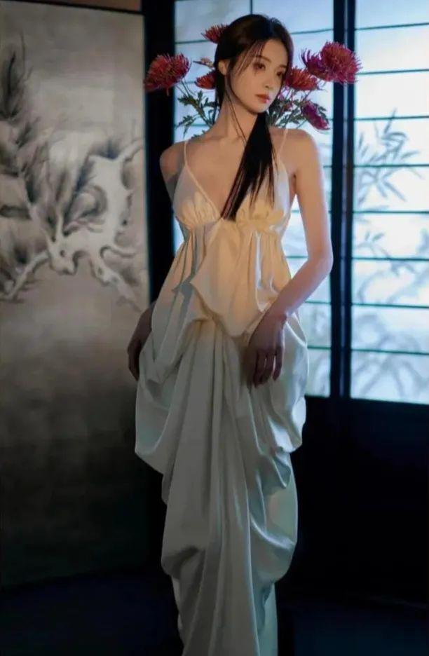 只见她穿着白色的吊带绸缎连衣裙,站在小红花前,一头乌黑的长发自然垂下,白皙的皮肤,修长的身材,完美的比例显露无疑,她真的太美了。
