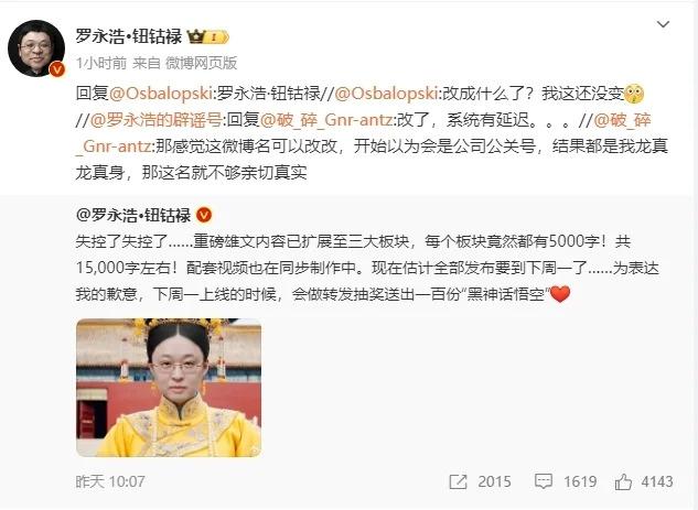 "15000 字 " 是指罗永浩预告自己的 " 重磅内容 ":" 失控了失控了 …… 重磅雄文内容已扩展至三大板块,每个板块竟然都有 5000 字!共 15,000 字左右!配套视频也在同步制作中。现在估计全部发布要到下周一了。他还配图 P 上了自己脸的熹贵妃回宫照。