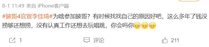 " 为啥参加披哥?有时候找找自己的原因好吧,这么多年了钱没捞够还想捞,没有认真工作还想去玩唱跳,你会吗你?"