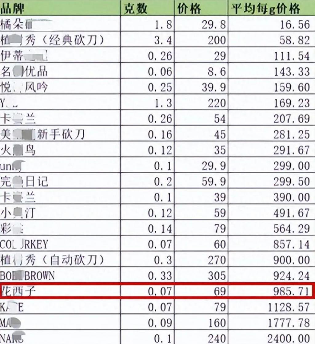 而且以克重来算,花西子的这款眉笔的每克平均价,翻了大牌好几倍。