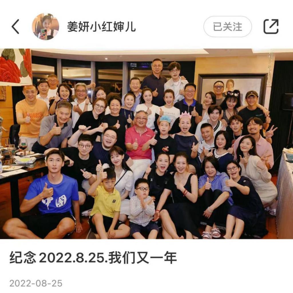 在 2022 年给宋丹丹庆生的合照里,姜妍旁边的这位戴着黑框眼镜、穿着黑色上衣的男子,就是姜妍的丈夫。