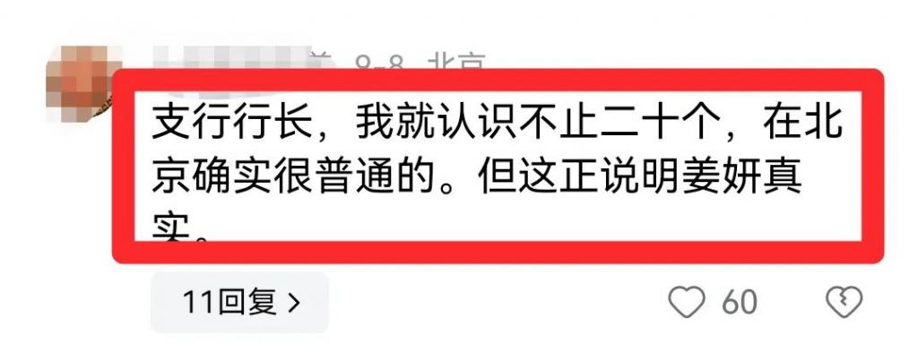 还有网友觉得," 支行行长,我就认识不止二十个,在北京确实很普通的,但这正说明姜妍真实 "。