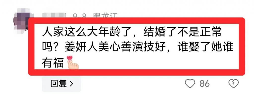 有网友说," 人家这么大年龄了,结婚了不是正常吗?姜妍人美心善演技好,谁娶了她谁有福 "。
