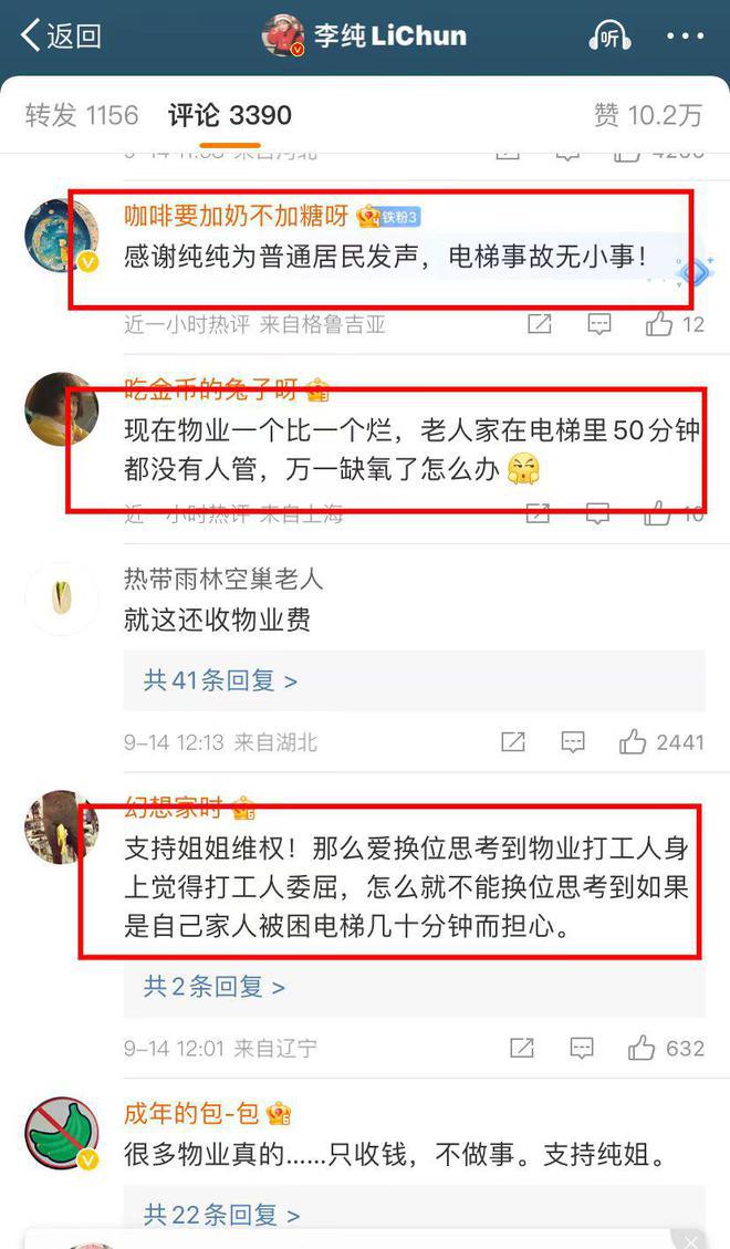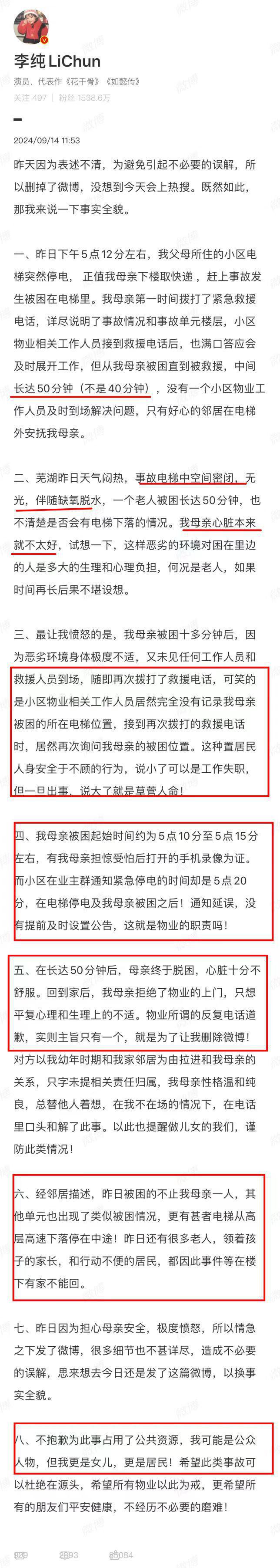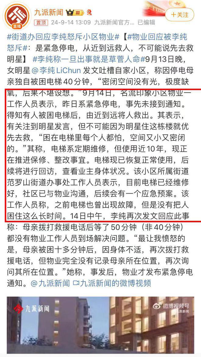 女星李纯的母亲被困所居住小区电梯长达 50 分钟,她发文怒斥物业不作为。