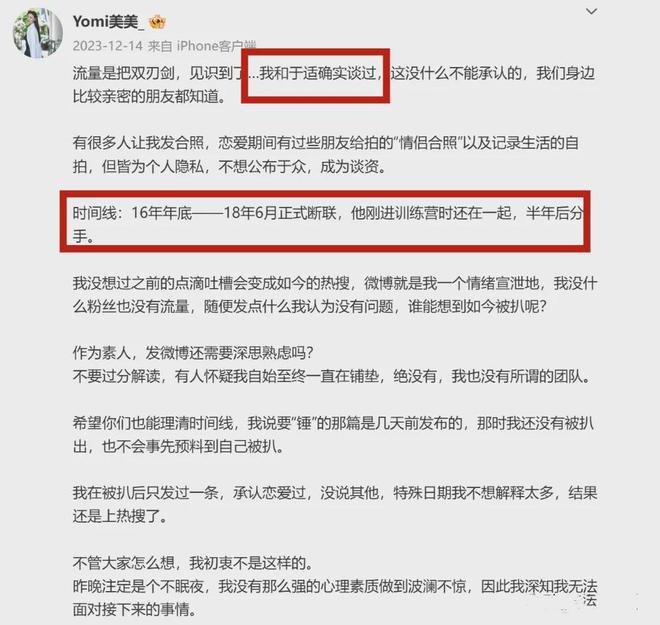 根据美美 2023 年 12 月 14 日对与于适恋情的回应可知,她承认她和于适谈过恋爱,他们从 2016 年年底谈到了 2018 年 6 月。于适进《封神》训练营时他们还在一起,半年后他们分手。