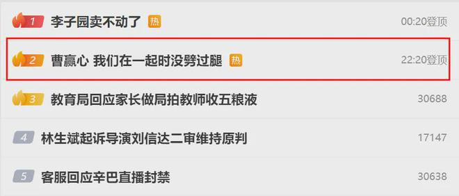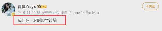 9 月 11 日晚 8 点多,曹赢心发文称 " 我们在一起时没劈过腿。" 她的回应一度冲上热搜第一。