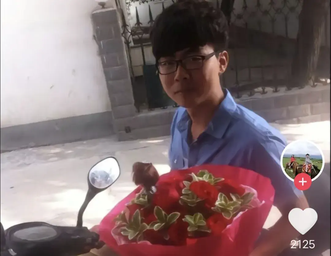 照片中,郭威身穿短袖衬衫,手捧鲜花,坐在一辆摩托车上,笑得很腼腆。看得出来,那时的郭威,略显青涩,不够成熟。