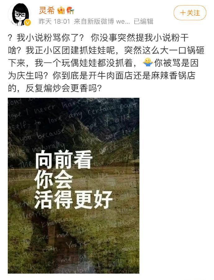 在看到这些评论时,她也在节目中说过称:“因为剧是小说改编的,有很多小说粉。个别为骂而骂的,反正也伤害不到我。”随后该剧的原著作者便在6月23日发文称:“我小说粉骂你了? 你没事突然提我小说粉干啥?我正小区团建抓娃娃呢,突然这么大一口锅砸下来,我一个玩偶娃娃都没抓着,你被骂是因为庆生吗?你到底是开牛肉面店还是麻辣香锅店的,反复煸炒会更香吗?”一时间引发了争论。