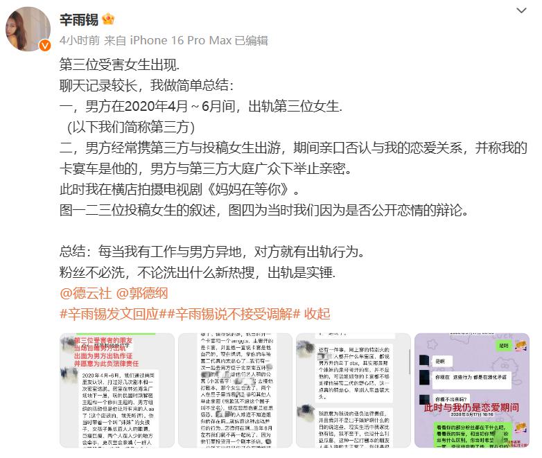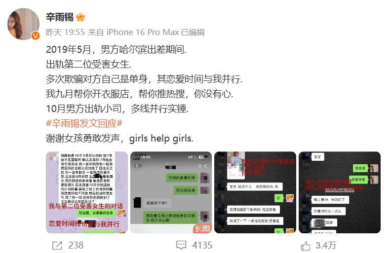 女孩这才知道自己当了小四,给辛雨锡真诚道歉。