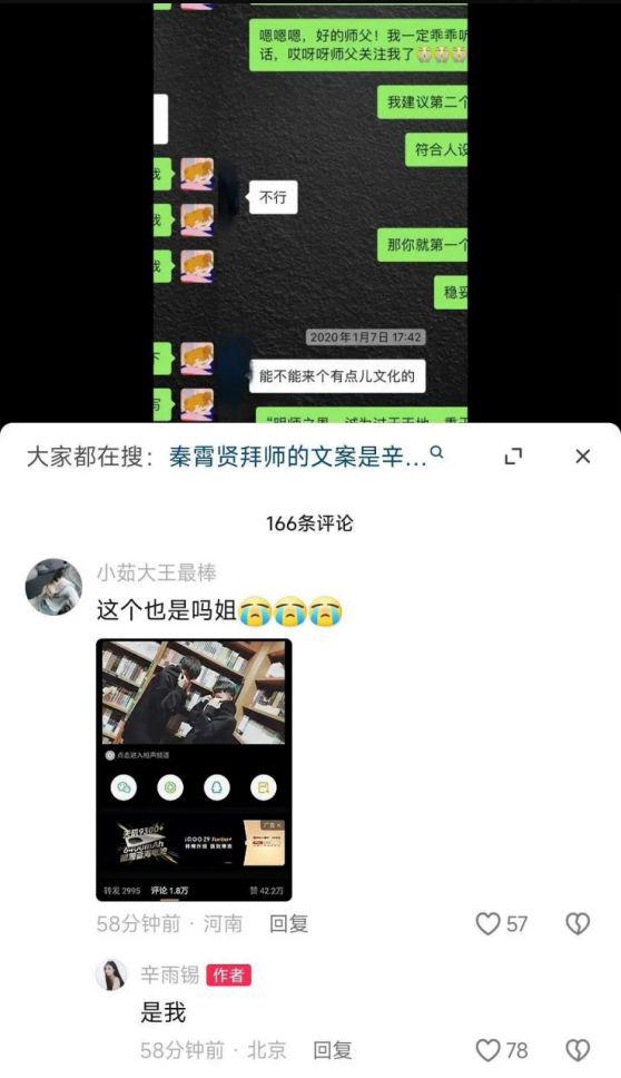 什么宠粉的话、拜师文案,几乎都是辛雨锡创作的。