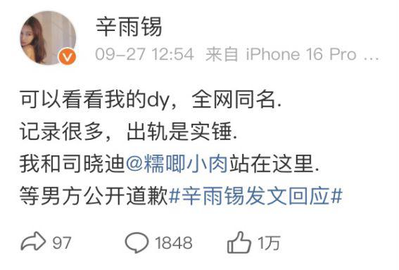 而当时被小三的司晓迪,也勇敢站了出来私信辛雨锡,提供了当年秦霄贤出轨自己的证据。